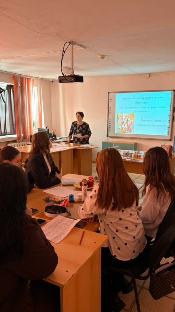 13.03.2026 преподаватель спецдисциплин «Алтайского высшего колледжа» по дошкольному обучению и воспитанию Калиева Майра Жайсанбаевна провела мастер-класс на тему «Использование современных образовательных технологий в развитии речи детей дошкольного возраста» для преподавателей колледжа с участием студентов 2 курса.