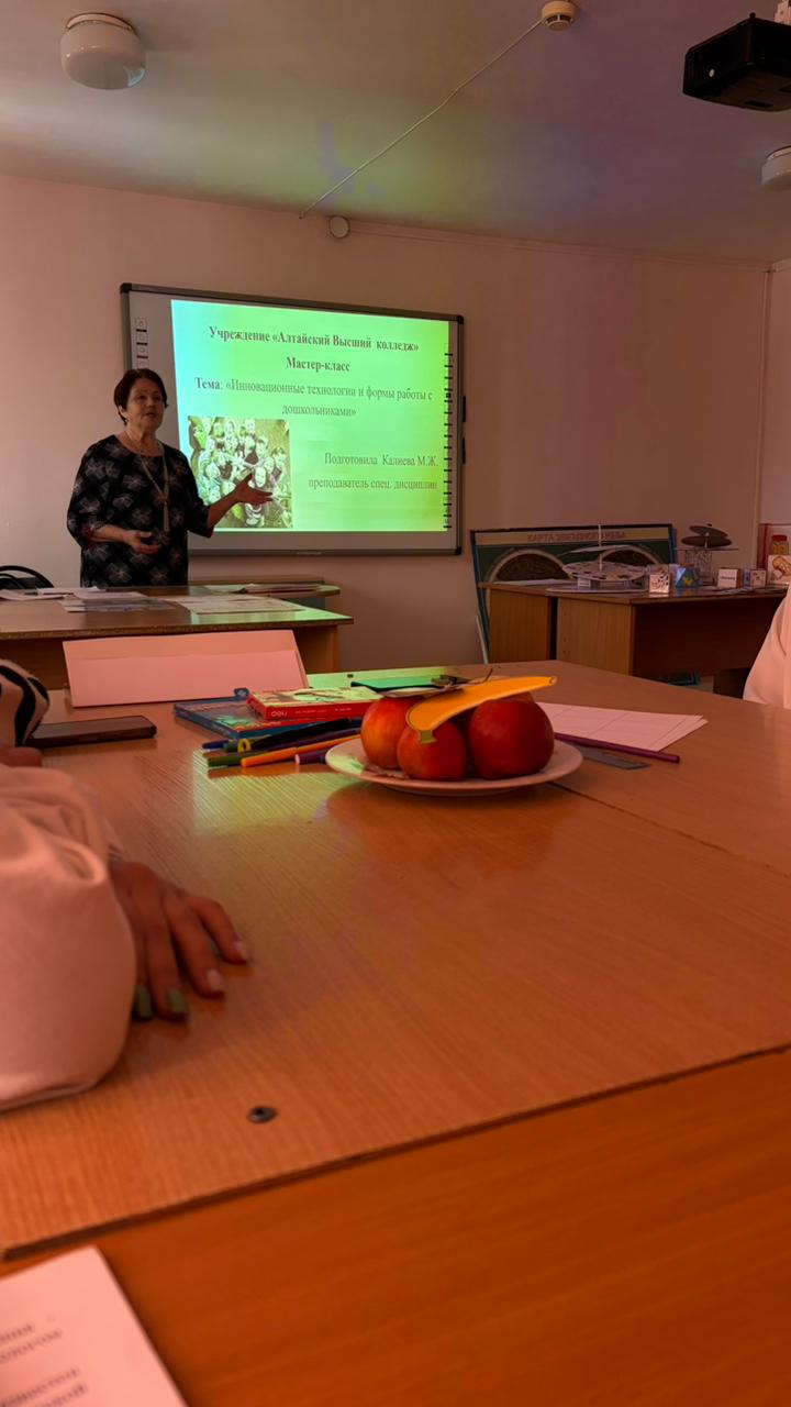 13.03.2026 преподаватель спецдисциплин «Алтайского высшего колледжа» по дошкольному обучению и воспитанию Калиева Майра Жайсанбаевна провела мастер-класс на тему «Использование современных образовательных технологий в развитии речи детей дошкольного возраста» для преподавателей колледжа с участием студентов 2 курса.