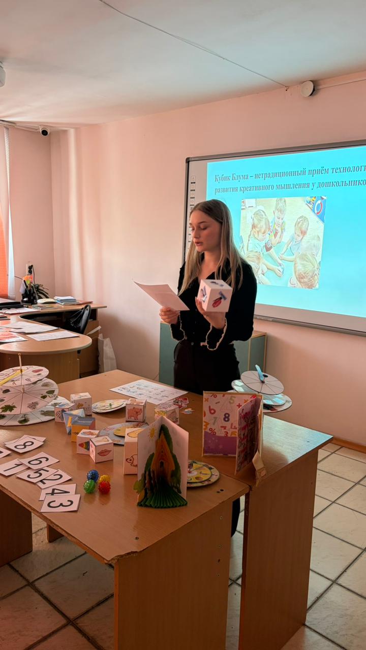 Студенты продемонстрировали методы ТРИЗ, включая «Сказкотерапию» — театрализацию сказок «Говорушки» и современной версии «Красной Шапочки». Также были представлены приёмы «Круги Луллия», «Кубик Блума», пальчиковая и артикуляционная гимнастика (видео), а также наглядный и дидактический материал, используемый на занятиях.