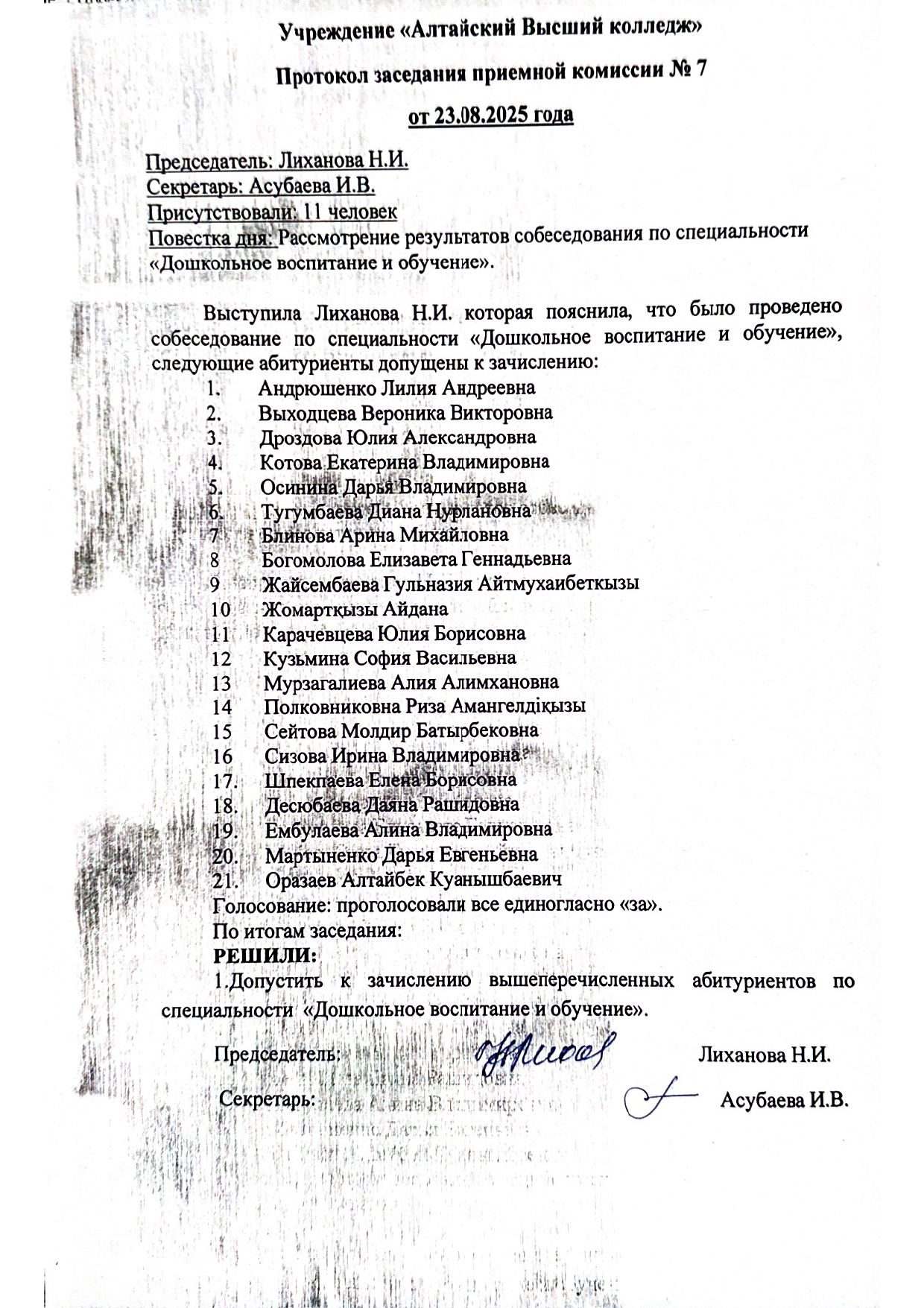 Протоколы заседания приемной комиссии от 23.08.2025 г.