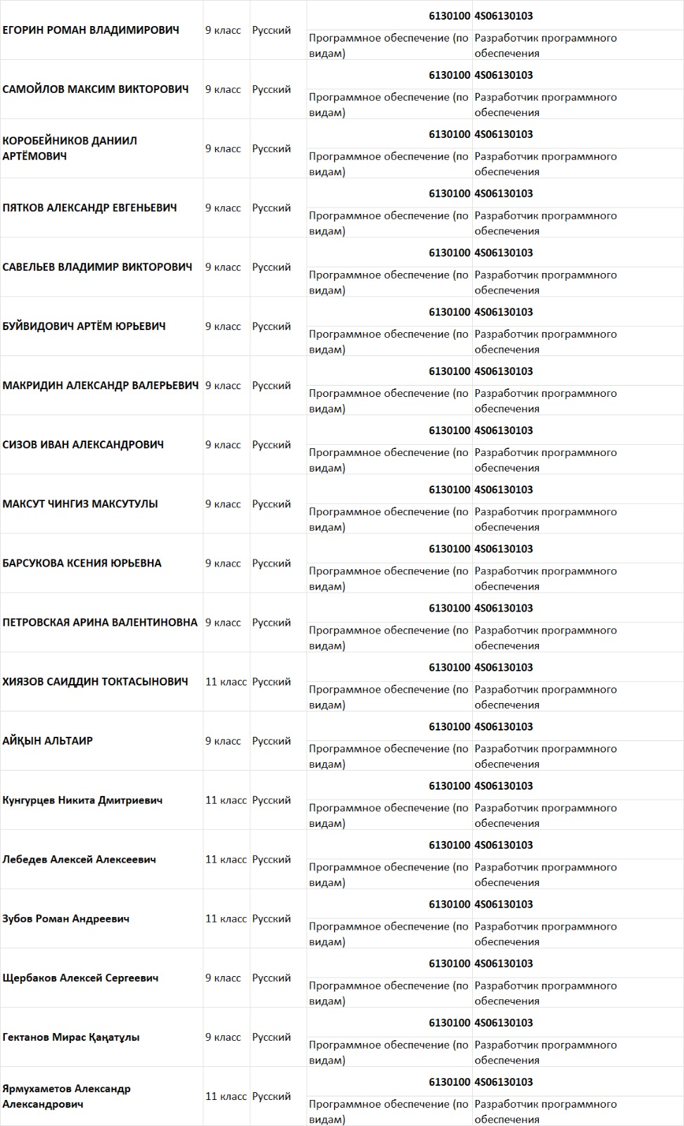 Список поступивших абитуриентов по государственному заказу на специальность 06130100 – «Программное обеспечение (по видам)»