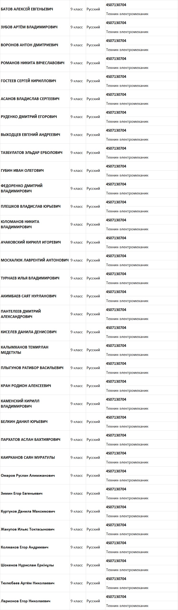Список поступивших абитуриентов по государственному заказу на специальность 07130700 – «Техническое обслуживание, ремонт и эксплуатация, электромеханического оборудования (по видам и отраслям)»
