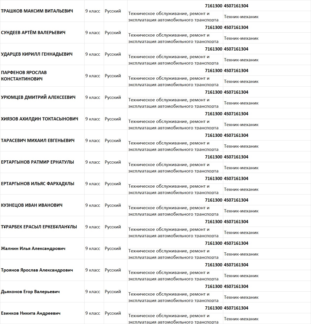 Список поступивших абитуриентов по государственному заказу на специальность 07161300 – «Техническое обслуживание, ремонт и эксплуатация автомобильного транспорта»